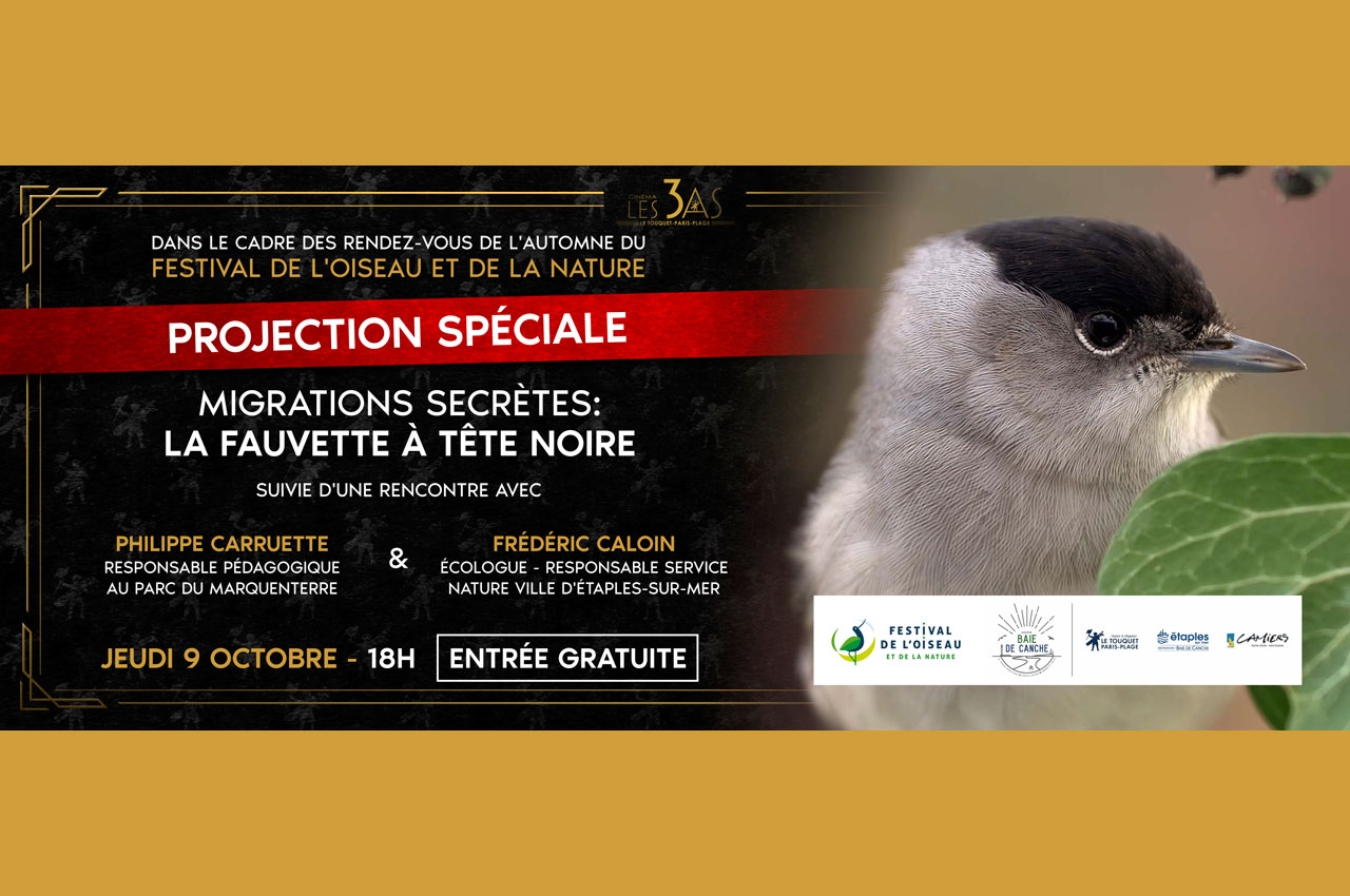 Dans le cadre des Journées Européennes de la Migration et des Rendez-vous de l’Automne (Festival de l’Oiseau et de la Nature), l’Association Baie de Canche propose une projection du documentaire « Migrations secrètes : la fauvette à tête noire » au Cinéma les 3AS du Touquet-Paris-Plage.