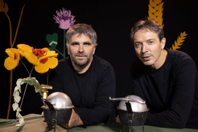 C’est à partir d’objets recyclés, de différentes matières et matériaux, du mélange des formes que se construit ce spectacle. Un jardin géant de velours vifs, de végétaux graphiques et chaleureux pour un théâtre d’objets, où 2 comédiens se glissent dans un décor végétal.