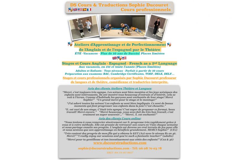 Stages et cours professionnels organisés par Sophie Ducouret professeur de langues et de théâtre, comédienne et traductrice-interprète.