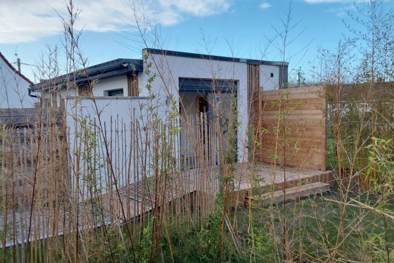 Une belle terrasse en bois exposée Est/Sud avec rampe d’accès et barbecue, donnant sur un jardin privatif bordé de bambous et de transats — un espace idéal pour se détendre, prendre un café ou un repas en plein air au soleil du matin et complètement protégè du vent.
