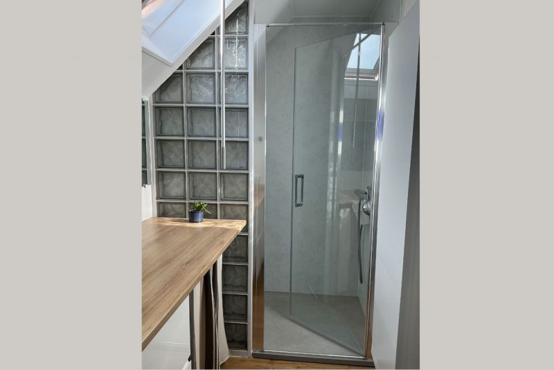 - Une salle de bain avec une grande douche, un wc et un plan vasque pour y installer vos affaires ainsi que de 2 grands tiroirs.