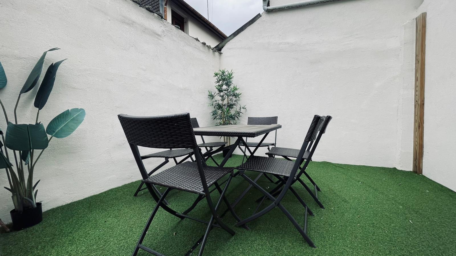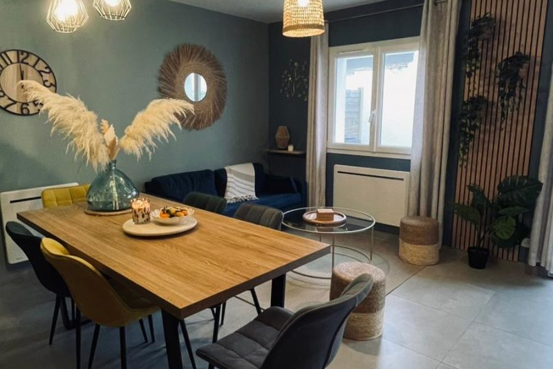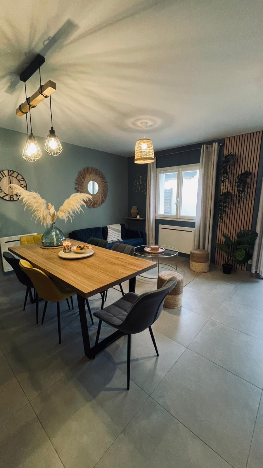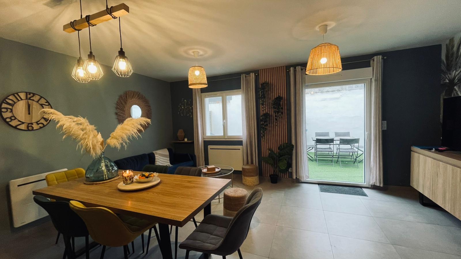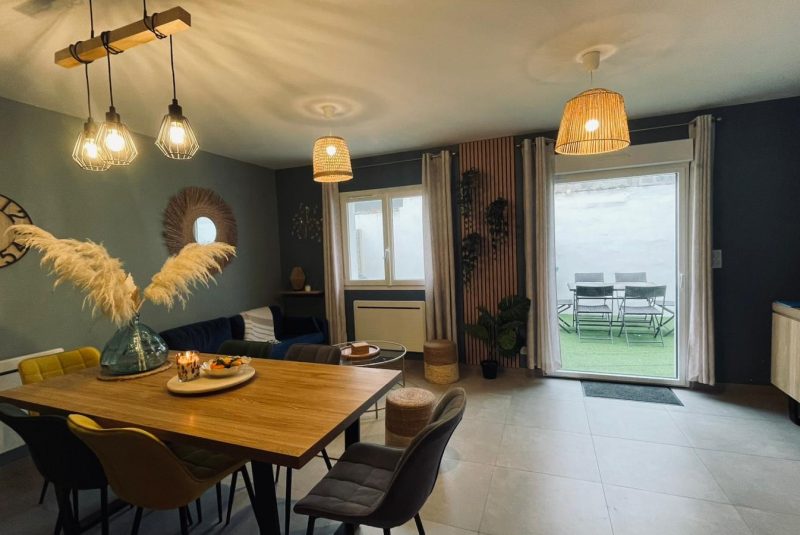 "Maison Sardines" pour 6 personnes. Chic et élégante, elle peut accueillir famille ou amis. Située entre la gare et le centre-ville. RDC avec pièce de vie, coin salon et repas avec cuisine équipé, 1 chambre et des toilettes. A l'étage : 2 chambres, salle de douche et toilettes. Terrasse avec salon de jardin. TV et wifi.